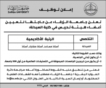 تــعــلــن جــامــعــــة الــزرقـــاء عــن حــاجــتــهـــا لــتــعــيــيــن