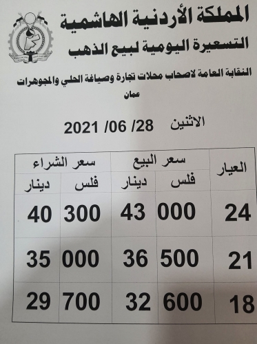 ووفق نقابة أصحاب محلات تجارة وصياغة الحلي والمجوهرات، فقد بلغ سعر بيع غرام الذهب عيار 21 الأكثر رغبة من الأردنيين بالسوق المحلية عند 36.50 دينارا لغايات شراء المواطنين من محلات الصاغة.
