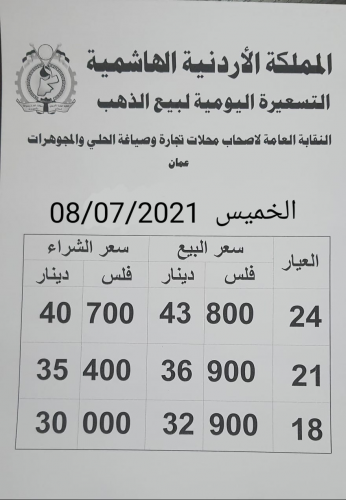أسعار الذهــــب اليوم الخميس 8/7/2021 بالعملة الوطنية الدينار الأردني ، وفق النقابة العامة لأصحاب محلات تجارة وصياغة الحلي والمجوهرات.