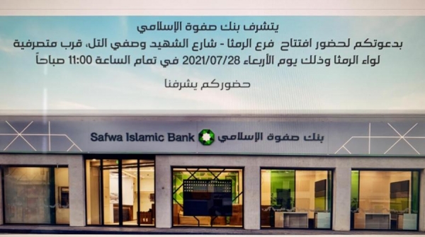 يفتتح بنك صفوة الإسلامي غداً الأربعاء فرعه في لواء الرمثا، ليكمل حلقات البنك المنتشر من أقصى شمال المملكة حتى جنوبها.