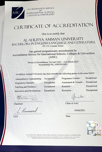 يتقدم رئيس وأعضاء مجلس أمناء جامعة عمان الاهلية بالتهنئة والتبريك من رئيس الجامعة الاستاذ الدكتور ساري حمدان ومن عميد كلية الاداب والعلوم (نائب الرئيس ) الاستاذ الدكتور نايل الشرعة ومن أسرة الكلية بالتهنئة والتبريك باستلام الكلية لشهادة الاعتماد الدولي البريطانية (ASIC ) في تخصصي اللغة الإنجليزية وآدابها واللغة الإنجليزية والترجمة، وبدرجة متميز (Exceptional ) حيث يستمر هذا الاعتماد لمدة أربع سنوات (2021 – 2025) للفترة ما بين 31-3-2021 ولغاية 31-3-2025، ليضاف ذلك إلى إنجازات الجامعة التي حققتها على مستوى الكليات كافة.