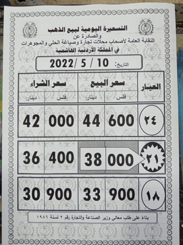 وبلغ سعر بيع الغرام الواحد من الذهب عياري 24 و18 لغايات الشراء من محلات الصاغة 44.60 دينارًا و 33.90 دينارا على التوالي.