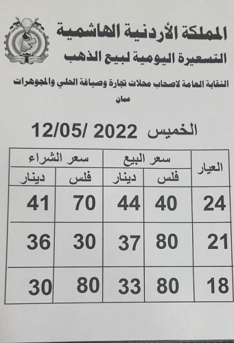 الرأي نيوز - انخفضت أسعار الذهب في السوق المحلي الأردني اليوم الخميس 30 قرشا، وفق التسعيرة الصادرة عن النقابة العامة لاصحاب محلات تجارة وصياغة الحلي والمجوهرات.