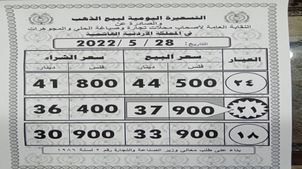 وبلغ سعر بيع الغرام الواحد من الذهب عياري 24 و18 لغايات الشراء من محلات الصاغة، عند 44.50 دينار و33.9 دينار على التوالي.