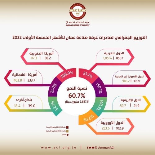 وسجلت صادرات الغرفة الى الجارة سوريا زيادة خلال الأشهر الخمسة الماضية من العام الحالي نسبتها 39 بالمئة، لتصل الى 47 مليون دينار مقارنة مع 34 مليون دينار لنفس الفترة من العام الماضي 2021.