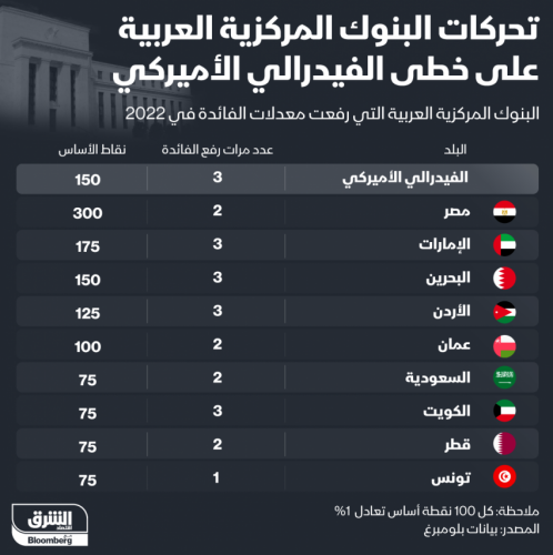 وتبعا لذلك، رفعت مصر أسعار الفائدة مرتين حتى الآن خلال العام الحالي بواقع 300 نقطة أساس، بينما رفعت الإمارات والبحرين والأردن والكويت أسعار الفائدة ثلاث مرات خلال 2022، فيما رفعت تونس أسعار الفائدة مرة واحدة خلال العام الحالي.