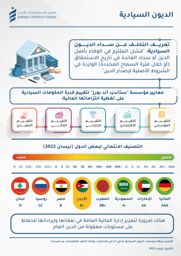 وفي سياق العوامل التي تؤثر على احتمالية التخلف عن سداد الدين السيادي، أشار المنتدى إلى ورقة العمل التي نشرها برنامج الأمم المتحدة الإنمائي (مواطن ضعف الديون السيادية في الاقتصادات النامية / 2021). والتي تم فيها مقارنة التصنيفات الائتمانية السيادية مقابل إجمالي الدين العام كنسبة من الناتج المحلي الإجمالي لـ 105 دول نامية، و73 من الاقتصادات الناشئة، و32 دولة من البلدان الأقل تطوراً. مبيناً أنه كلما ارتفعت نسبة الدين العام إلى الناتج المحلي الإجمالي، انخفض مقياس التصنيف السيادي علماً بأن تصنيف الأردن يأتي متوسطاً ضمن هذا التصنيف.