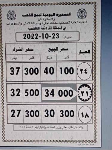 وبلغ سعر غرام الذهب 21 الأكثر رغبة لدى المواطنين عند 34 دينارا للشراء ، و 32.50 دينارا لغاية البيع لمحال الصاغة.