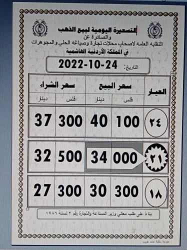 وبلغ سعر غرام الذهب 21 الأكثر رغبة لدى المواطنين عند 34 دينارا للشراء ، و 32.50 دينارا لغاية البيع لمحال الصاغة.