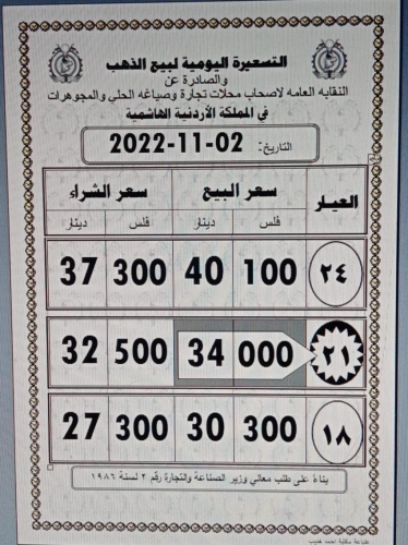 وبلغ سعر شراء الغرام الواحد من عيار 21، الأكثر طلبا بين الأردنيين 34.00 دينارا فيما بلغ سعر البيع للصاغة 32.50 دينارا.