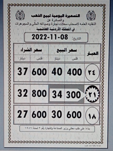 وبلغ سعر بيع غرام الذهب عيار 21 الأكثر رغبة من الأردنيين بالسوق المحلية عند 34,30 دينارا لغايات شراء المواطنين من محلات الصاغة مقابل 32.80 لغايات البيع.