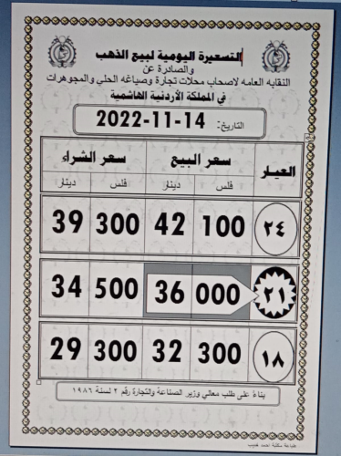 وبلغ سعر غرام الذهب عيار 21 الاكثر طلبا في السوق المحلية 36.00 دينارا لجهة البيع للمواطنين، مقابل 34.50 لجهة البيع للمحلات.