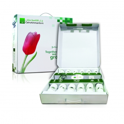 ويحتوي كل صندوق على 12 لمبة توفير طاقة وساعة رملية لتخفيض استهلاك المياه واداة قياس لدرجة حرارة تبريد الثلاجات في المنازل و مصباح شحن يدوي.