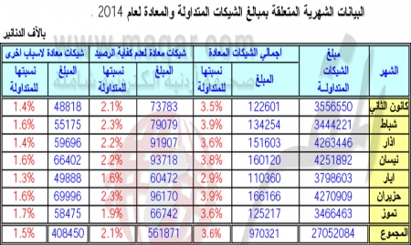 وتظهر الارقام ان اجمالي قيمة الشيكات المتداولة 27 مليار دينار، تم تداولها من خلال 6.2 مليون شيك، منها 308 الاف شيك معاد، منها 186 الف شيك بدون رصيد.