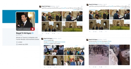 استغل وزير السياحة والآثار نايف الفايز نشاطه على موقع التواصل الاجتماعي "تويتر" لدعم السياحة الأردنية، إلى جانب نشاطاته التقليدية في الوزارة.