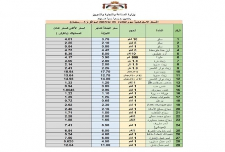 الراي نيوز - أصدرت وزارة الصناعة والتجارة والتموين النشرة الاسترشادية لأسعار السلع الغذائية الأساسية ليوم غد الثلاثاء والتي يتم اعدادها يومياً لإرشاد المواطنين للاسعار العادلة واصل المستهلك.