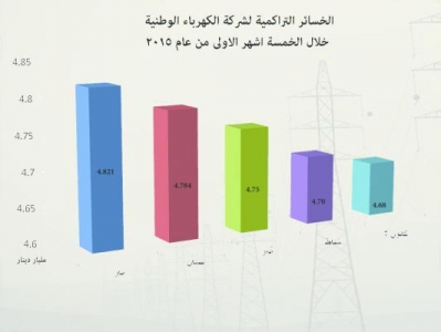 - ارتفعت خسائر شركة الكهرباء الوطنية خلال الخمسة أشهر الاولى من العام الحالي 181 مليون دينار 4 %، مقارنة مع ما كانت عليه خلال العام الماضي لتصل الى 4.82 مليار دينار، حسب بيانات وزارة المالية.
