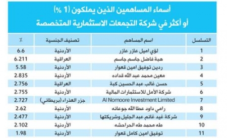 يشار إلى أن حجم المشاريع المقترحة قد تتطلب زيادة في رأس مال الشركة إلى نحو 500 مليون دينار اردني (2.6 مليار درهم إماراتي)، فيما أكد مجلس الإدارة أن تحديد حجم الزياد على رأس المال سيتم بصورة نهائية فور الانتهاء من إعداد الدراسات الفنية المشار اليها. وبمقارنة أسعار الإغلاق للشركات المتداولة أمس والبالغ عددها 118 شركة مع إغلاقاتها السابقة، فقد أظهرت 31 شركة ارتفاعاً في أسعار أسهمها، و 46 شركة أظهرت انخفاضاً في أسعار أسهمها.أما على مستوى القطاعي، ارتفع الرقم القياسي لقطاع الصناعة بنسبة 0.43 %، وارتفع الرقم القياسي لقطاع الخدمات بنسبة 0.24 %، وارتفع الرقم القياسي للقطاع المالي بنسبة 0.18 %. أما بالنسبة للقطاعات الفرعية، فارتفع الرقم القياسي لقطاع الصناعات الاستخراجية والتعدينية، الفنادق والسياحة، الطاقة والمنافع، الخدمات الصحية، البنوك، الخدمات التجارية، التأمين، الأدوية والصناعات الطبية 1.79 %، 0.65 %، 0.60 %، 0.44 %، 0.33 %، 0.26 %، 0.09 %، 0.08 % على التوالي. في حين انخفض الرقم القياسي لقطاع صناعات الورق والكرتون، العقارات، الصناعات الكهربائية، النقل، التكنولوجيا والاتصالات، صناعات الملابس والجلود والنسيج، الأغذية والمشروبات، الصناعات الهندسية والانشائية، التبغ والسجائر، الخدمات التعليمية، الخدمات المالية المتنوعة 5.80 %، 1.01 %، 0.99 %، 0.94 %، 0.92 %، 0.87 %، 0.60 %، 0.36 %، 0.34 %، 0.20 %، 0.10 % على التوالي. وبالنسبة للشركات الخمس الأكثر ارتفاعاً في أسعار أسهمها فهي مساكن الأردن لتطوير الأراضي والمشاريع الصناعية بنسبة 4.61 %، أبعاد الأردن والإمارات للاستثمار التجاري بنسبة 4.44 %، العالمية للوساطة والأسواق المالية بنسبة 4.35 %، الاتحاد العربي الدولي للتأمين بنسبة 4.30 %، وعمون الدولية للاستثمارات المتعددة بنسبة 4.08 %. أما الشركات الخمس الأكثر انخفاضاً في أسعار أسهمها فهي العربية للمشاريع الاستثمارية بنسبة 6.67 %، المحفظة العقارية الاستثمارية بنسبة 5.56 %، الشرق الأوسط للكابلات المتخصصة/مسك_الأردن بنسبة 5.26 %، داركم للاستثمار بنسبة 5.00 %، والمتكاملة لتطوير الاراضي والاستثمار بنسبة 4.93 %.