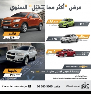 - أطلقت أبو خضر للسيارات (شركة الآليات الرائدة) الوكيل الحصري لعلامات شفروليه، جي إم سي، كاديلاك، وأوبل في المملكة عرض 'أكثر مما تتخيل السنوي' على مجموعة من سيارات شفروليه المميزة. ويقدم هذا العرض الخاص خيارات عديدة متنوعة تلبي كافة الاحتياجات بإقتناء احد سيارات شفروليه سبارك، سونك، كروز، تراكس وكابتيفا بدفعات شهرية منافسة.