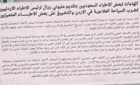وتختتم الصحيفة قائلة : كل ذلك أدى الى تشكيل لوبي من الاطباء غير المتميزين بأدائهم وخبراتهم او اصحاب الاجور المرتفعة جدا (الجشعين) ومحاولة النيل من السياحة العلاجية التي يتميز بها الاردن والتي ابتدأت بحملات تشويه ضد الاطباء الناجحين والمتميزين في الاردن عبر وسائل التواصل الاجتماعي (فيسبوك وتويتر...وغيره) مرورا بالحملات الدعائية المغرضة عبر القنوات الفضائية ولينتهي مسلسل الاستغلال للمواطن السعودي باتهامات لبعض اطبائنا بتقديم مليوني ريال لرئيس الاطباء الاردنيين وذلك من أجل التضييق والتشويش على بعض الاطباء المعروفين في الاردن.