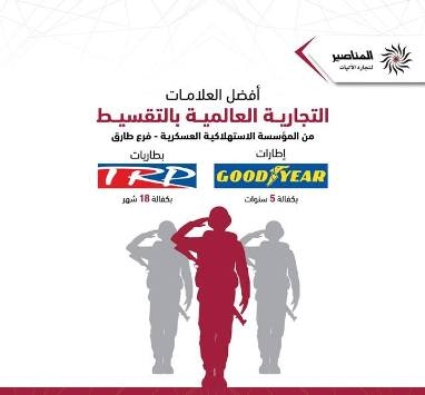 - أعلنت المناصير لتجارة الآليات (العاديات السريعة) عن إمكانية شراء إطارات Goodyear وبطاريات TRP بالتقسيط بالتعاون مع إدارة القوات المسلحة الأردنية (المؤسسة العسكرية) في خطوة تستهدف التسهيل على منتسبي القوات المسلحة الأردنية (الجيش العربي) لشراء احتياجاتهم من هذه المنتجات، وتقديرا لجهودهم ودورهم الفاعل في الحفاظ على أمن المملكة وإبقائها واحة أمان لكل من عليها. وسيكون ذلك متاحا ابتداءا من الشهر الحالي من خلال المؤسسة الاستهلاكية العسكرية، فرع طارق.