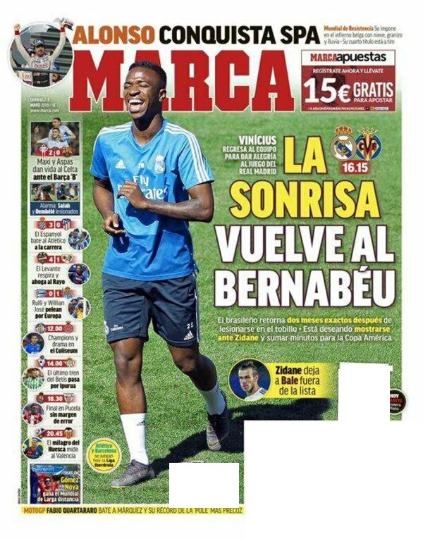 وأضافت: "فينيسيوس يعود للفريق لمنح البهجة لريال مدريد، البرازيلي يظهر بعد شهرين بالضبط من إصابة كاحله، ويرغب في اللعب وإضافة دقائق مع زيدان من أجل المشاركة في كوبا أمريكا".