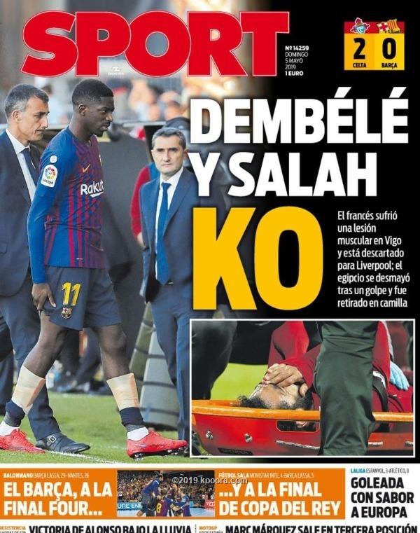 سلطت الصحف الإسبانية الصادرة صباح اليوم الأحد، الضوء على إصابة عثمان ديمبلي نجم برشلونة ضد سيلتا فيجو، وكذلك محمد صلاح، مهاجم ليفربول أمام نيوكاسل، قبل مواجهة الفريقين في أنفيلد، الثلاثاء المقبل، بإياب نصف نهائي دوري أبطال أوروبا.