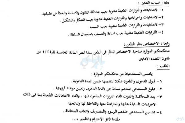 وتمحورت لائحة الشكوى صورة عنها حول أربعة بنود اعتمد المشتكون عليها في الطعن ولخصت بأن الانتخابات والقرارات الطعينة مشوبة بعيب مخالفة القانون والانظمة والخطأ في تطبيقها ومشوبة أيضاً بعيب الشكل والتشكيل وبعيب السبب وبعيب الإساءة والتعسف بالسلطة.