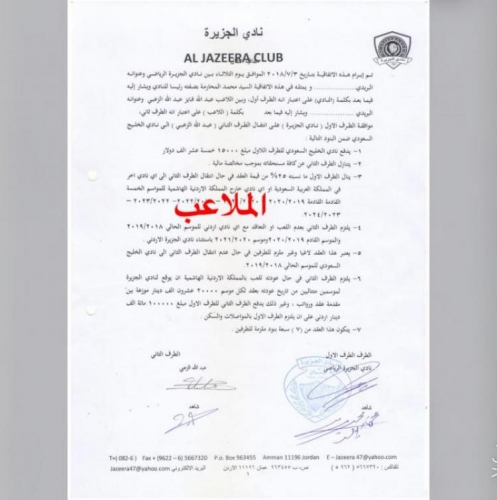 وصلت صحيفة الملاعب صورة للعقد المبرم بين اللاعب عبدالله الزعبي ونادي الجزيرة والذي يثبت أحقية الشياطين بالحصول على خدمات حارس المرمى العائد من تجربة احتراف في السعودية.