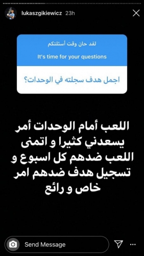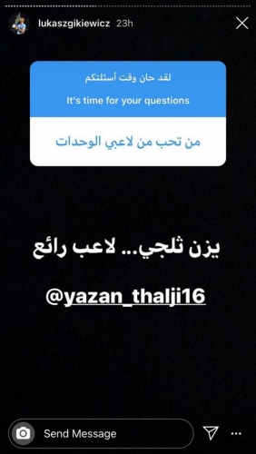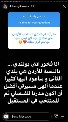 ورد لوكاس على سؤال أحد المتابعين عن إمكانية تمثيل منتخب النشامى، 'أنا فخور أنني بولندي، بالنسبة لي فالأردن هي بلدي الثاني وسأعود إليها عندما أنهي مسيرتي مدرباً للفيصلي ومن ثم المنتخب'.
