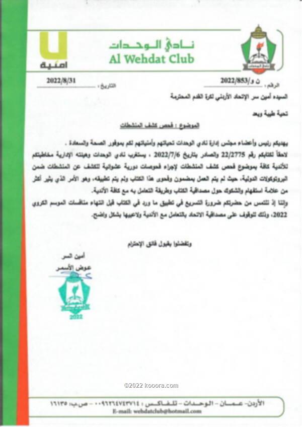 وبحسب أمين سر النادي، عوض الأسمر، فإن اتحاد الكرة خاطب الأندية كافة بتاريخ 6/7/2022، بخصوص إجراء فحص دوري عشوائي للكشف عن المنشطات.