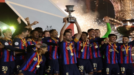توج نادي برشلونة بطلا للكأس السوبر الإسبانية لكرة القدم بفوزه على غريمه التقليدي ريال مدريد 3-1 الأحد على ملعب الملك فهد في الرياض