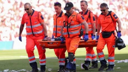 ووضع الأطباء دعامة لرقبة الحارس البالغ عمره 31 عاما، ونُقل إلى المستشفى للخضوع لفحوصات كإجراء احترازي.