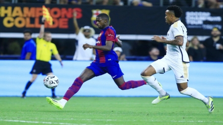 وجلس ديمبيليه على مقاعد البدلاء خلال الفوز على ميلان الإيطالي 1-0 في لاس فيغاس في ختام برشلونة جولته التحضيرية في الولايات المتحدة.