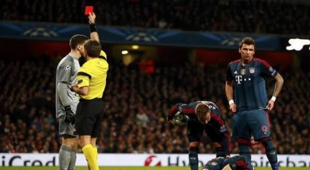 وفاز بايرن ميونيخ باللقاء بهدفين لصفر ، مستغلا لعب أرسنال بعشرة لاعبين منذ الدقيقة 37 بعد طرد الحارس البولندي .