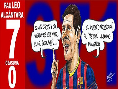 نشرت صحيفة ” سبورت” الكتالونية، صورة كاريكاتيرية للنجم الأرجنتيني ليونيل ميسي ساحر برشلونة الإسباني، والذي كان تألق وأحرز ثلاثة أهداف في سباعية الفريق الكتالوني أمام أوساسونا في إطار الجولة 28 من الدوري الإسباني على ملعب ” كامب نو ” .