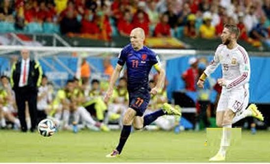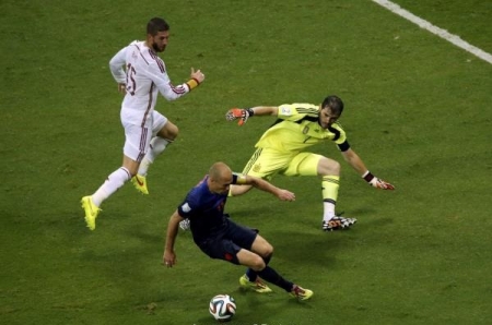 ولكن جمهور برشلونة عبر الشبكات الاجتماعية وجد الفرصة أخيرا ليثأر من جمهور مدريد واعلامه بعدما حدث مع مدافعه راموس يوم آمس من قبل أرين روبين نجم هولندا الذي فعل مع راموس مافعله بيل مع بارترا وليس هذا فقط بل جعل كاسياس أضحوكة في هذه اللقطة وفي هذا الهدف الذي سجله .