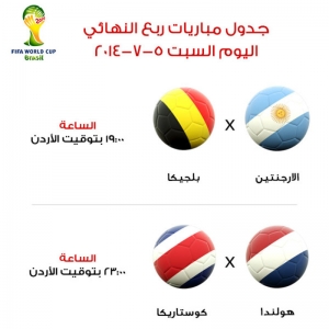 جدول مباريات اليوم السبت 5\7 \2014 اضافة الى تشكيلة الفرق المتوقعة وحكام المباريات واستاد المباراة وسعته اضافة الى توقيت المباريات بحسب التوقيت المحلي :