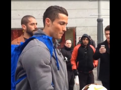فقد تنكر رونالدو بزي مشرد وراح يتسكع في أحد شوارع مدريد، إلى أن ظهر المعجب الطفل في المكان، فسارع النجم البرتغالي بخلع ثيابه التي بدت متسخة، كما نزع عن رأسه باروكة شعر غيرت من شكل مظهره الخارجي، وكذلك فعل بشارب مستعار.