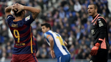 رد إطار المرمى تسديدتين لليونيل ميسي ولويس سواريز ليتعادل فريقهما برشلونة بدون أهداف مع إسبانيول ضمن منافسات دوري الدرجة الأولى الإسباني لكرة القدم وهو ما يمنح أتلتيكو مدريد فرصة تصدر المسابقة إذا فاز على ليفانتي في وقت لاحق من اليوم السبت. وأحرز برشلونة180 هدفا في عام 2015 وهو رقم قياسي إسباني لكن هجوم الفريق فشل في التسجيل اليوم في مرمى المنافس الذي قدم أداء جيدا خاصة في الشوط الأول. وسدد ميسي كرة من ركلة حرة في الشوط الأول لكن الكرة ارتدت من العارضة وأهدر سواريز - الذي أحرز 26 هدفا هذا الموسم - فرصة واضحة للتسجيل في الشوط الثاني بعد أن سدد الكرة في القائم. ويملك برشلونة39 نقطة بفارق نقطة واحدة عن أتلتيكو بعد أن لعب كل منهما 17 مباراة. ويأتي ريال مدريد في المركز الثالث برصيد 36 نقطة وسيخرج لمواجهة بلنسية غدا الأحد.