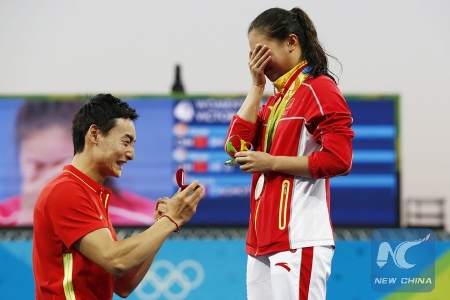 - لم تكد تمر سوى دقائق على حصول الصينية هي زي على فضية الغطس من على منصة مرنة من ارتفاع 3 أمتار في دورة الألعاب الصيفية (ريو 2016)، حتى وجدت أمامها مفاجأة تمثلت في زيارة من رفيقها العاطفي الذي طلب منها الزواج أمام الجمهور المتواجد في مركز (ماريا لينك) للألعاب المائية.