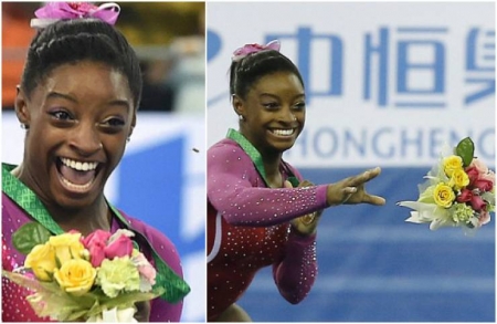 ومع صعودها لمنصة التتويج، أعادت بايلز ذاكرة محبيها لموقف ظريف حصل معها عند تتويجها بميدالية ذهبية في بطولة العالم 2014 في الصين عندما هاجمتها نحلة من باقة الورود التي كانت تمسكها.
