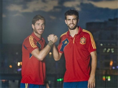 دافع الاعب جيرارد بيكيه مدافع نادي برشلونة عن نفسه، باستخدام قميص زميله المدريدي سيرحيو راموس أمام الصحافة، لإثبان أن قميص منتخب إسبانيا بالكم ليس به علم الدولة.