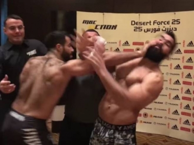 وتداول رواد عبر مواقع التواصل الاجتماعي فيديو يظهر الاشتباك القوي بين الطرفين قبل اللقاء، فخلال عملية الوزن والتقاط الصورة قبل اللقاء استفز أحدهما الآخر، قبل أن يدخلا في شجار عنيف، ولولا تدخل الحكام وزملاء الطرفين في القاعة لحدث ما لا يحمد عقباه.