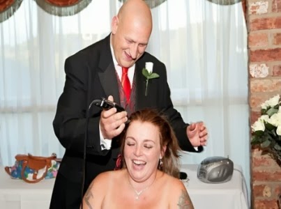 أقدمت عروس بريطانية في يوم زفافها علي حلاقة شعر رأسها بالكامل، وذلك بعد أن طلبت من عريسها أن يتولى المهمة بنفسه باستخدام ماكينة حلاقة كهربائية في مسعى لرفع الوعي من أجل التبرع لمعهد بحوث السرطان البريطاني.