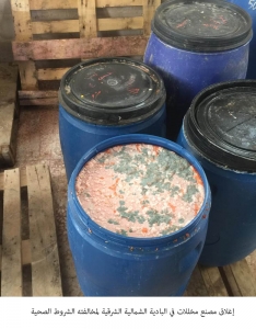كما عثرت اللجنة على بركة مياه للصرف الصحي مكشوفة تحاذي المصنع خصصت لتجميع المياه العادمة الخارجة منه اضافة الى تسريب للتمديدات الصحية للمياه العادمة داخل وخارج المصنع الى جانب تواجد الحشرات والعفن على البراميل المخصصة للتصنيع. ولفت السحيم، الى انه تم التحفظ على الكميات المخالفة لاشتراطات الصحة والسلامة العامة واتلافها بالطرق العلمية السليمة وتحويل اصحاب المصنع الى الجهات المتخصصة لاتخاذ الاجراءات القانونية والادارية وجبة الاتباع حيال المخالفين.