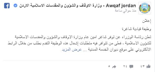 أعلنت رئاسة الوزراء اليوم الأحد، عن توفر شاغر أمين عام وزارة الأوقاف والشؤون والمقدسات الإسلامية للشؤون الاسلامية .