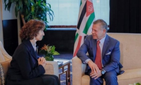 التقى جلالة الملك عبدالله الثاني، بحضور سمو الأمير الحسين بن عبدالله الثاني ولي العهد، في نيويورك أمس الاثنين، المديرة العامة لمنظمة الأمم المتحدة للتربية والعلم والثقافة "اليونسكو" أودري أزولاي.