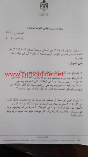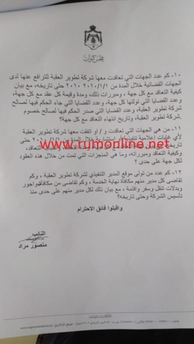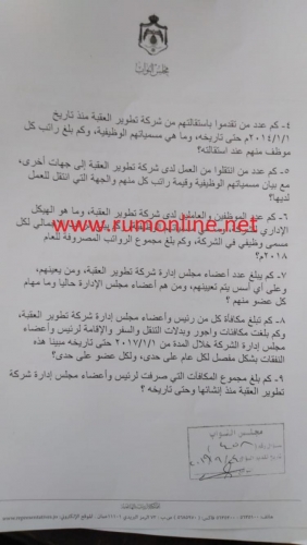 وجه النائب منصور مرادسؤالا نيابيا الى الحكومة يتعلق بشركة تطوير العقبة وتاليا نص السؤال كما وردنا :