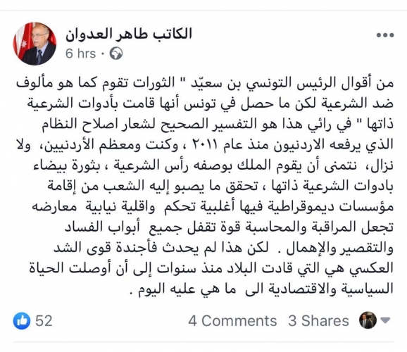 كتب الوزير الاسبق طاهر العدوان عبر حسابه الخاص على الفيس بوك ان نتمنى أن يقوم الملك بوصفه رأس الشرعية ، بثورة بيضاء بادوات الشرعية ذاتها ، تحقق ما يصبو إليه الشعب من إقامة مؤسسات ديموقراطية فيها أغلبية تحكم واقلية نيابية معارضه تجعل المراقبة والمحاسبة قوة تقفل جميع أبواب الفساد والتقصير والإهمال .